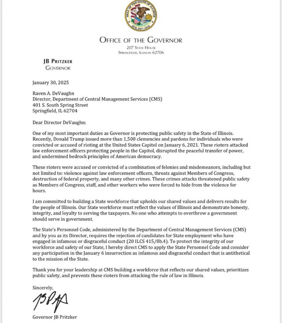 Governor J.B. Pritzer (D-IL) issued an order prohibiting employment of any of the January 6, 2021, attackers of the Capitol who received a pardon or commutation from Donald Trump.