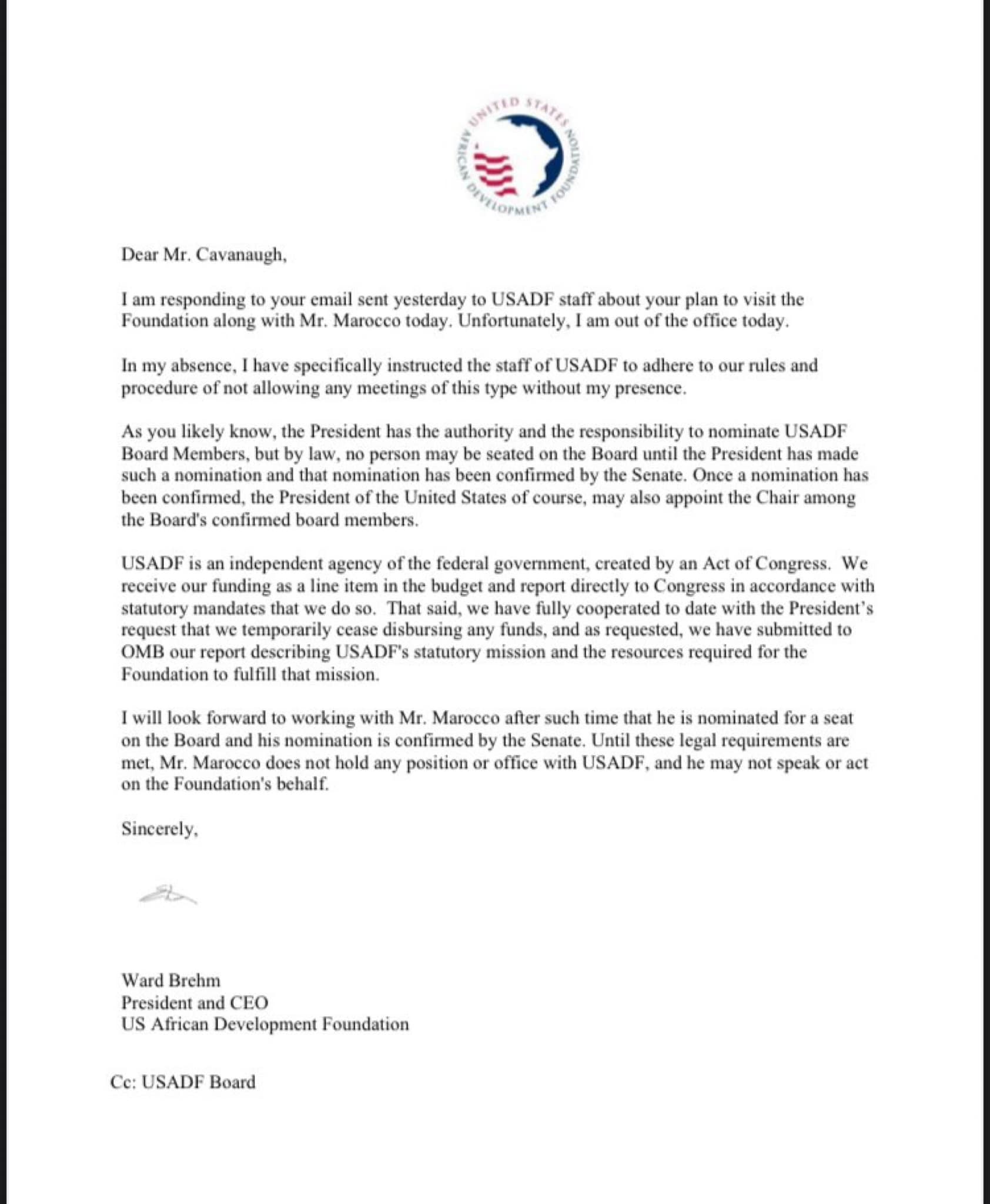 Ward Brehm, President and CEO of the African Development Foundation issued a letter to DOGE denying access to Peter Marocco until he is duly nominated and confirmed to the USAID board by the Senate.
